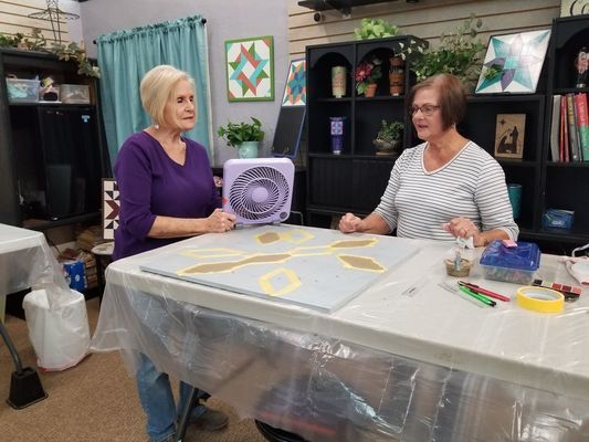 Mary Fredricks and Lois Thomason were in The Marketplace on Main Street for one of Oard's barn-quilt painting sessions. They said they came from Oklahoma City because of the segment on Discover Oklahoma. Another woman, who just moved to Oklahoma from California, said she was attracted by the same information. All three women called Oard because of the clip.